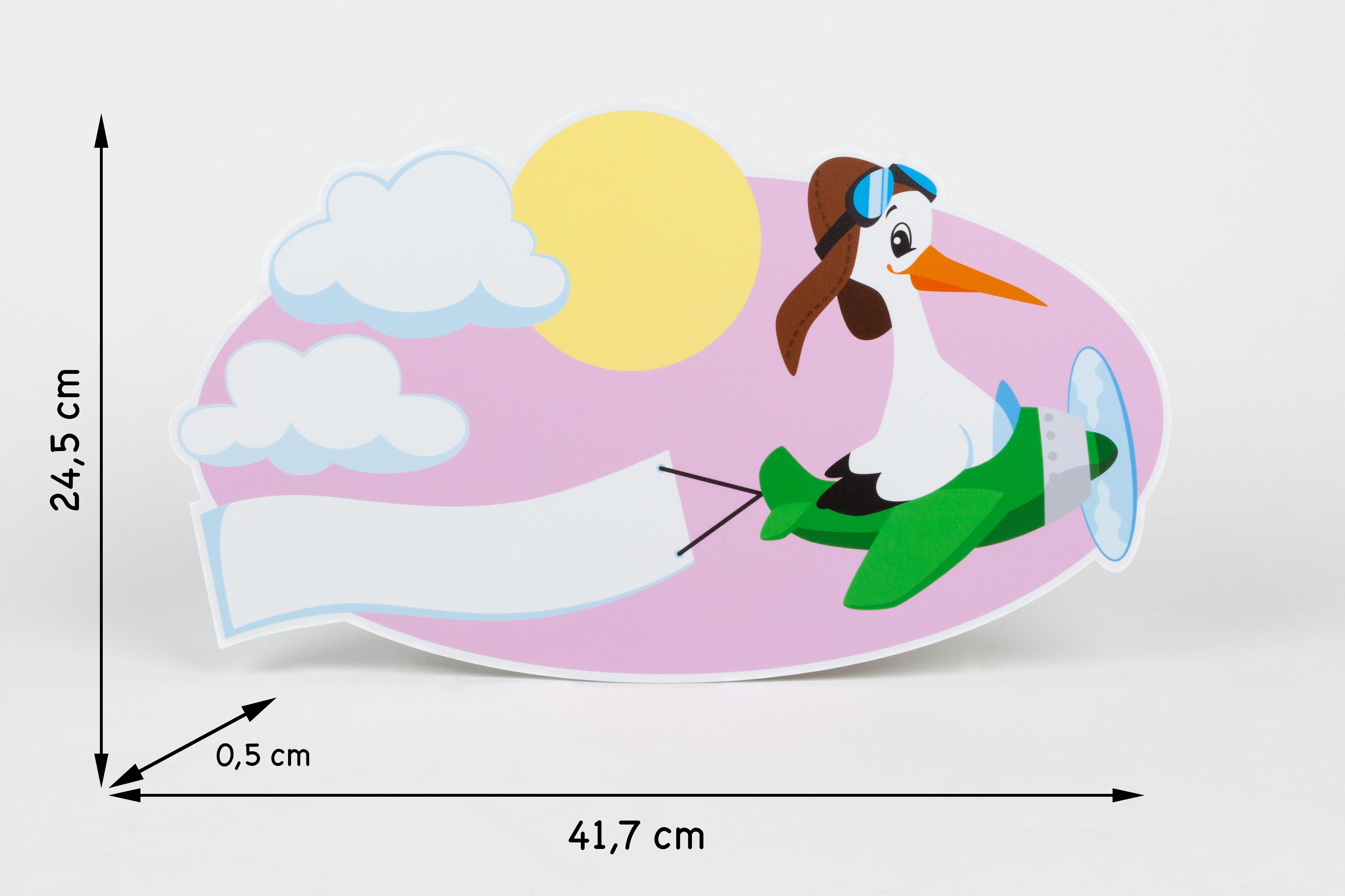 Produktinformationen "Klapperstorch Schild für das Neugeborene mit dem Motiv Storch im Flugzeug rosa"